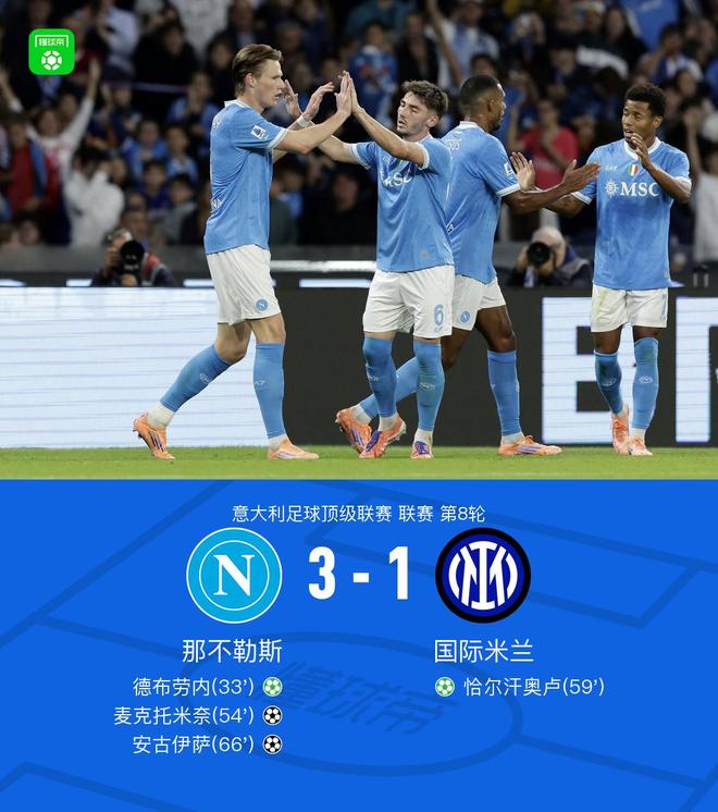 北京时间10月26日,意大利足球甲级联赛第8轮,那不勒斯主场迎战国际米兰。上半场迪洛伦索进球,德布劳内任意球破门。然而,在主罚点球时,比利时人肌肉拉伤,被迫离场。下半场麦克托米奈凌空抽射破门。邦焦尔诺进球,恰尔汗奥卢主罚命中。内雷斯助攻,安圭萨进球。全场比赛结束,那不勒斯3-1击败国米,在意甲暂时领先。关键比赛第34分钟,迪洛伦索破门,德布劳内罚进点球,那不勒斯1-0获胜。第54分钟,麦克托米奈死角抽射破门,国际米兰扩大领先优势,0-2。第60分钟,邦焦尔诺手球送出,恰尔汗奥卢主罚点球,国际米兰1-2。第67分钟,内雷斯助攻,安圭萨进球,那不勒斯3-1。球员们第9分钟,两队比分交替领先。比赛即将开始。比赛中,球击中巴斯托尼的肩膀,擦过门框离开底线。第12分钟,劳塔罗踢倒邦焦尔诺,邦焦尔诺痛苦倒地。第13分钟,博尼创造球,恰尔汗奥卢远射偏出。第15分钟,那不勒斯防守区内出现失误,劳塔罗的射门被扑出。 21分钟的质量并不高。吉尔摩的射门偏出。第32分钟,姆希塔良疑似受伤离场。第34分钟,泽林斯基替补登场,迪洛伦索破门,德布劳内主罚点球,那不勒斯1-0获胜。第36分钟,德布劳内不幸主罚点球,主罚命中。第41分钟,巴斯托尼头球攻门险些击中门框飞出。第45+1分钟,希传给邓弗里斯,但劳塔罗的射门偏出。第45分钟+3巴斯托尼传球D乌姆弗里斯头球击中门柱。第47分钟,泽林斯基传球,恰尔汗奥卢射门。第54分钟,他们凭借一脚进球扩大领先优势。麦克托米奈向盲区抽射。国际米兰0-2。第60分钟,邦焦尔诺手球送出。随后,恰尔汗奥卢主罚命中。第65分钟,国际米兰1-2。乐观的德布劳内拄着拐杖回到了替补席。第67分钟,那不勒斯凭借内雷斯的助攻和安古萨的进球,将比分改写为3-1。那不勒斯在第90分钟做出换人,换上斯皮纳佐拉。技术统计