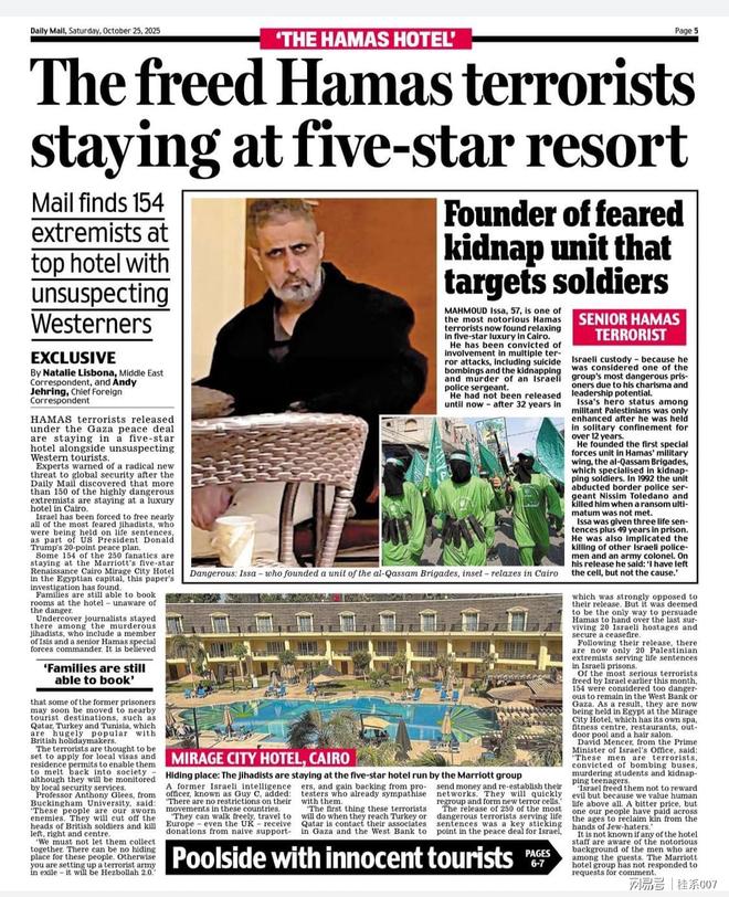 据外媒报道,在最近的人质交换协议中获释的约150名哈马斯恐怖分子目前入住埃及开罗五星级万丽酒店。根据协议,这些人将被送往其他伊斯兰国家安置,但目前没有国家愿意接收他们,只能暂时安置在酒店。这意味着普通游客可以与因绑架和袭击而被监禁的恐怖分子住在同一家酒店,使用同一家游泳池和餐厅。安全专家对此感到担忧。以色列强调,释放这些囚犯是交换人质,而不是对犯罪的奖励。哈马斯表示,这些人正在等待重新安置。资料来源注:信息主要来自外媒报道(如《印度时报》、《路透社》)和社交网络。经证实,他们确实入住了该酒店,但目前尚不清楚他们是否会前往其他地方未来不再尝试。获释的恐怖分子现在与无辜游客共用酒店,并使用游泳池、餐馆和水疗中心等设施,这引起了安全专家的担忧。其中包括哈马斯第101特种部队创始人马哈茂德·伊萨。尽管他们的背景不稳定,但他们仍在等待重新安置的可能性,可能是在土耳其、卡塔尔或突尼斯等国家。一些人通过巴勒斯坦权力机构的赔偿计划获得了财政援助。以色列表示,释放囚犯是为了保护人质,而不是为他们的罪行付出代价。