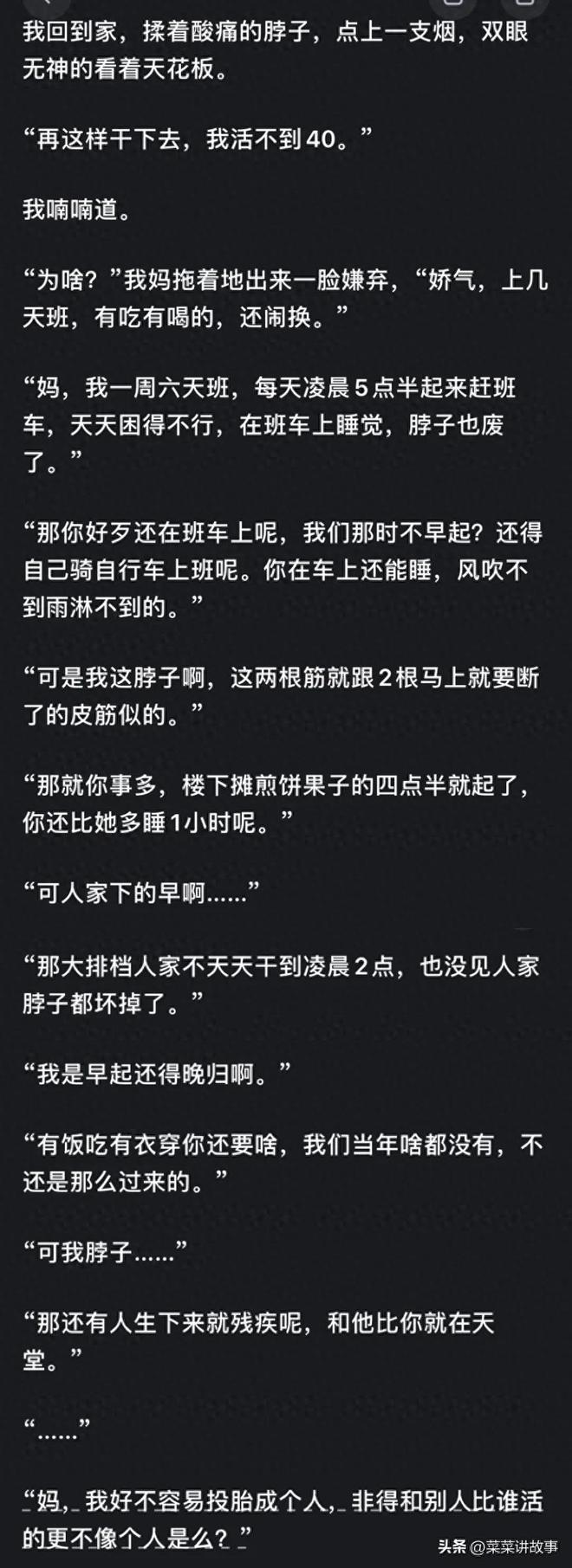 父母不理解现代年轻人的绝望,但原因却很现实。他这一代人中的大多数人都经历过苦难,认为他们所需要的只是食物和工作。然而,如今竞争激烈,房价不断上涨,努力工作并不总是有回报。他们习惯了一步一步走下去,不理解我们面临的焦虑和困惑。不同的时代,不同的经历。他们发现很难同情我们这一代人的压力和绝望。下面是很多网友的分享。我们一起来看看吧!当事情很糟糕时:看看别人家里的孩子的处境是多么悲惨。经济好的时候:注意人们富有时的前景。那时大学生的价值与今天研究生的价值没有什么不同。他们经常领取如此高的养老金。过去确实有托儿所,但没必要过多修饰。日托环境非常有限,可能无法为今天的父母所接受。事实上,男人和女人都会累。如果不能互相理解,活着就没有意义了!差别太大了……我很无奈……哈哈哈……父母就是这样。他们看到并羡慕别人的成就,并希望你也这样做并向他们学习。这句话的刺耳程度足以叫醒一个装睡的人。这是非常真实的。现在,我认为所有那些建议“或多或少就足够了”的人都只是在工地上搬砖。你移动的砖块越少,你赚的钱就越少。但实际上,如果你减少旅行,你的收入也会减少。身体不会说谎,每一次自欺欺人都会留下痕迹。当然,我没听懂。以前我身体很累,但现在我的心和思想很累。那不是真的。当你休息时,第二天你会感到精力充沛,但也会给精神和情绪带来更多压力我在你身上。第二天我醒来就想跳楼。就跟中毒一样疼。读完这篇文章你有何感想?我们邀请您在评论区分享您的想法!评论区见。