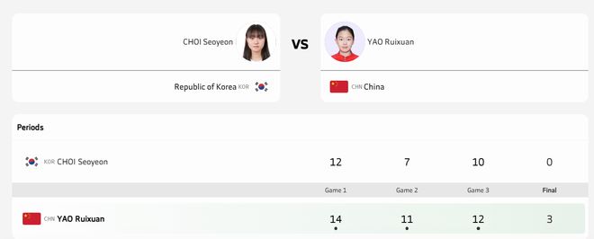 小编:2025年第三届亚青会女单四分之一决赛,国乒选手姚瑞贤以3-0战胜韩国乒乓球选手崔瑞妍[14-12]。