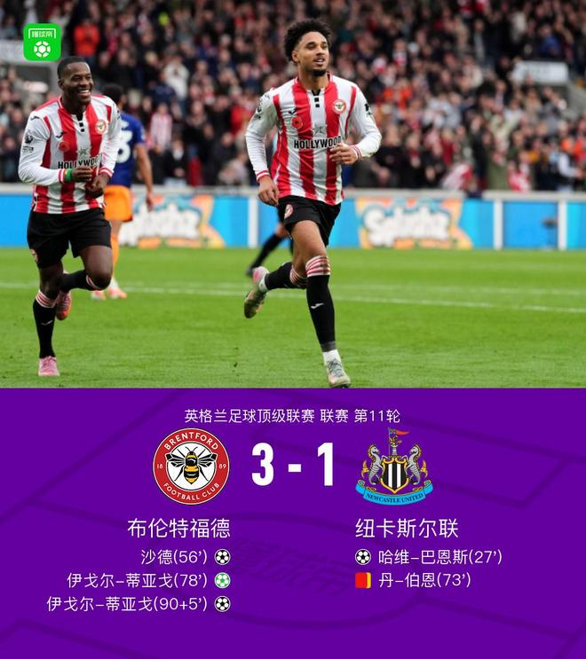 北京时间11月9日,英超第11轮比赛,布伦特福德主场迎战纽卡斯尔联。哈维·巴恩斯在比赛中取得领先。沙德头球扳平比分。丹·伯恩在丢球后离开了球场。伊戈尔·蒂亚戈梅开二度,帮助布伦特福德锁定胜局。最终布伦特福德3-1击败纽卡斯尔联。关键比赛第28分钟,哈维·巴恩斯继续适应,冷静射门。纽卡斯尔1-0领先。看看英超联赛就知道了。米格第56分钟,沙多前身头球破门。布伦特福德1-1战平。第79分钟,蒂亚戈点球破门。第90分钟,布伦特福德2-1纽卡斯尔。 +6分钟,蒂亚戈低射梅开二度,布伦特福德3-1纽卡斯尔。第17分钟,布伦特福德继续施压,但波普神勇扑救拯救了曼城。第23分钟,乔林顿受伤,无缘比赛被替换下场。第28分钟,哈维巴尔内斯继续调整,郑镇静打进一球,纽卡斯尔1-0领先。第56分钟,沙德挺身而出,头球破门。布伦特福德1-1战平。第61分钟,瓦塔拉禁区内倒地。裁判在咨询VAR后并未判罚点球。第73分钟,丹·拜恩禁区内犯规,被罚下场。两张黄牌变成红牌,他被罚下场。 7' 7' 纽卡斯尔的步伐恶化。波普受伤,被拉姆斯代尔替换。伊戈尔·蒂亚戈在第79分钟主罚点球破门。布伦特福德2-1纽卡斯尔。伊戈尔·蒂亚戈在第90分钟和第6分钟低射打进两球。布伦特福德3-1纽卡斯尔 球队阵容技术统计【咪咕独家观看英超】
