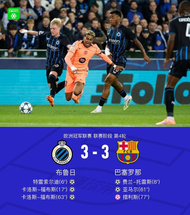 北京时间11月6日,欧冠联赛第四轮,布鲁日对阵巴塞罗那。上半场福布斯助攻,特雷索尔迪进球。费尔明传球,费兰光速扳平比分。主队在佐里斯的助攻和福布斯的贡献下迅速做出反应。下半场,费尔明脚后跟助攻,亚马尔扳平比分。瓦纳肯送出直塞球,福布斯再次主队领先。亚马尔传球并看似射门,但特索利斯不慎打进自家球门。补时阶段,弗曼放倒什琴斯尼破门,但主裁泰勒在查看VAR后判定进球无效。全场比赛结束,巴塞罗那3-3战平布鲁日。决定性比赛进行到六分钟后,特雷索尔迪接到福布斯的助攻得分。巴塞罗那0-1。第8分钟,他们很快将比分追平。在 Fermín 的支持和 Phelan 的贡献下。巴塞罗那1-1。第17分钟,福布斯反击破门佐利斯助攻。巴塞罗那1-2。第62分钟,费兰进球。埃尔明后脚跟得球,亚马尔扳平比分,巴塞罗那2-2。第65分钟,瓦纳肯助攻,福布斯单刀破门。第78分钟,巴萨第三次扳平,比分2-3。亚马尔的传球和射门似乎创造了一个乌龙球。巴塞罗那3-3,对于两队球员来说都是伟大的时刻。当我进入游戏时,游戏立即开始。第3分钟,佐里斯低射,什琴斯尼将球没收。第6分钟,福布斯助攻,特雷索尔迪破门,巴萨0-1。第8分钟,他们很快扳平比分,在费尔明和费兰的助攻下,巴塞罗那1-1领先。第13分钟,费尔明在门柱外左脚射门,但稍稍偏出底线。第17分钟,福布斯反击,佐里斯助攻破门,巴萨1-2。第22分钟,布鲁哈斯解围后击中队友,球弹向球门。幸好被门卫没收了。第28分钟,丛大镇射门被亚马尔传球接到。球击中横梁。第39分钟,拉什福德低射,杰克尔斯门将倒地将球扑出。第43分钟,巴尔德将球传给费尔明,后者替补射门。第45分钟,亚马尔直传。费兰的射门偏出。第46分钟我开始感到有点焦虑。费兰有一个梯子。第51分钟,力压对手的佐里斯直传。华金·塞 (Joaquín Ce) 射门被什琴斯尼 (Szczesny) 挡出。第52分钟,拉什福德射门被挡出。亚马尔跟进射门,但被门将挡出。第60分钟,巴萨做出改变。莱万多夫斯基和奥尔莫被放在替补席上。第62分钟,费伊尔敏脚后跟传球,亚马尔扳平比分,巴萨2-2。第65分钟,瓦纳肯助攻,福布斯投篮得分。巴塞罗那2-3。第70分钟,亚马尔劲射,被门将杰克尔斯扑出。第73分钟,福布斯禁区内倒地不起,第78分钟,主裁判安东尼·泰勒观看VAR后推翻了判罚,第三次将比分扳平。亚马尔传射,打进乌龙球。巴塞罗那3-3。第90分钟,费门特放倒什琴斯尼破门,但泰勒在看了VAR后推翻了球队阵容的技术统计。