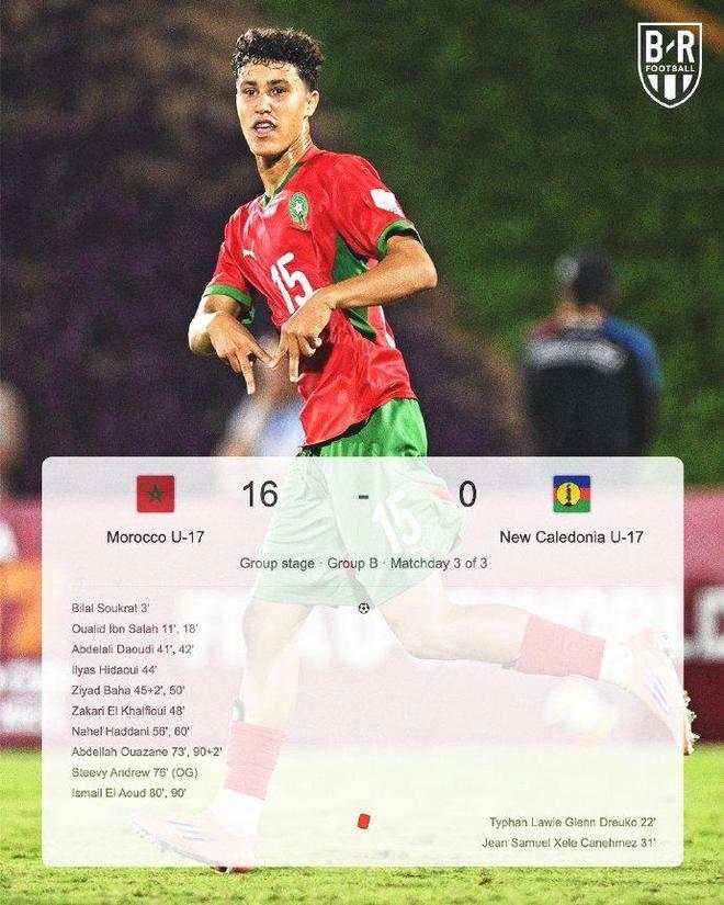 北京时间11月10日结束的2025年卡塔尔U-17世界杯B组最后一场比赛中,人口仅有29万的大洋洲岛国新喀里多尼亚以0-16不敌摩洛哥。他们以1平2负的战绩,小组垫底,无缘出线。小组赛第二场比赛,新喀里多尼亚队出人意料地抵挡住了日本男足的36次射门,将对手打成0球,爆冷拿下一分。然而,新喀里多尼亚队在这场比赛中表现不佳,在前12分钟内连续丢了三个球。随后新喀里多尼亚0-3落败,第22分钟和第31分钟两名球员先后被罚下场。最终,由九名球员组成的新喀里多尼亚队上半场丢了七个球,下半场又丢了九个球。全场比赛摩洛哥共射门80次,其中29次射正,最终以16-0获胜。新喀里多尼亚队3次射门,0次射正。凭借这场胜利,摩洛哥队三场比赛一胜二负,排名小组第三。本届U17世界杯共有48支球队被分为12个小组。每组前两名和前八组第三名将获得参赛资格。前两轮,摩洛哥0-2战平日本、0-6葡萄牙,以-8净胜球的优势垫底,出线面临危险。不过,随着本场比赛的胜利,摩洛哥队的净胜球扩大到了8个,相对第3组排名第一的球队处于有利地位。同组的另一场比赛,日本队以2-1击败葡萄牙队,以2胜1平积7分的成绩位列小组第一。葡萄牙2胜1负积6分排名小组第2。两队共同努力赢得了第一名。